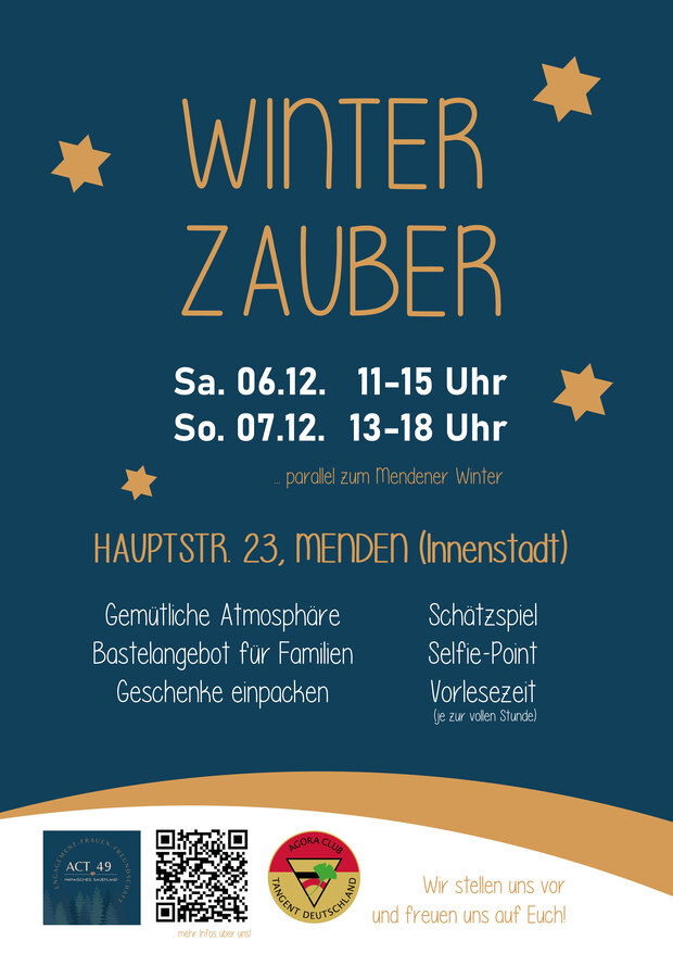 Der Winterzauber ist ein Angebot für alle Altersgruppen, sich über den ACT zu informieren und außerdem ein paar spannende Dinge im Ladenlokal zu erleben. Für Familien gibt es verschiedene Bastelangebote – außerdem wird zu jeder vollen Stunde eine vorweihnachtliche Geschichte vorgelesen. Des Weiteren gibt es einen Selfie-Point mit weihnachtlichen Motiven, ein Schätzspiel mit einem Gewinn und einen Service zum Geschenke einpacken. Alles erfolgt kostenfrei gegen Spenden.