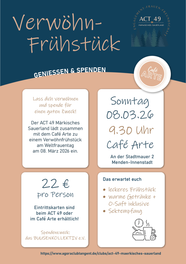 Der ACT 49 Märkisches Sauerland lädt alle Interessierten am Sonntag, den 08.03.2026 zu einem Verwöhnfrühstück anlässlich des Weltfrauentags ein.