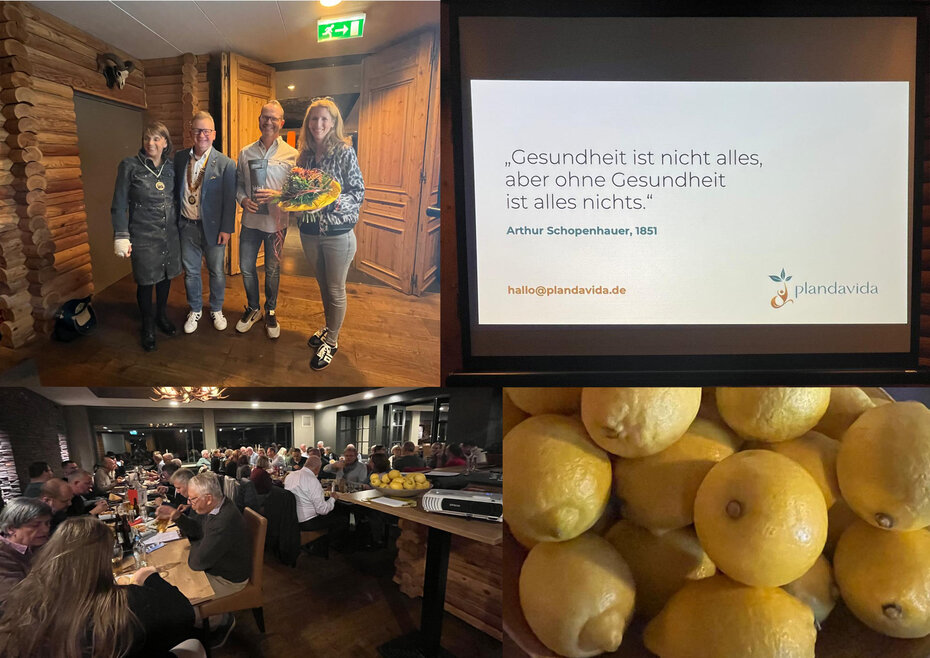 Der informative Vortrag »Gesundheitsprävention« von unserer ehemaligen Tangent Lady Andrea von der Firma Plandavida weckte großes Interesse in unserer Kleeblatt-Gemeinschaft. Eine interaktive Präsentation stellte Fragen und suchte Antworten darauf, wie wir alle möglichst lange gesund und fit bleiben können. Eine persönliche Biomarker-Analyse schafft Klarheit, was dem Körper fehlt. Zum Abschied gab es eine Zitrone…als vitaminreiche Starthilfe, die Wunder wirkt, sobald sie frisch gepresst in warmen Wasser noch vor dem Frühstück getrunken wird. Wir probieren´s aus!
